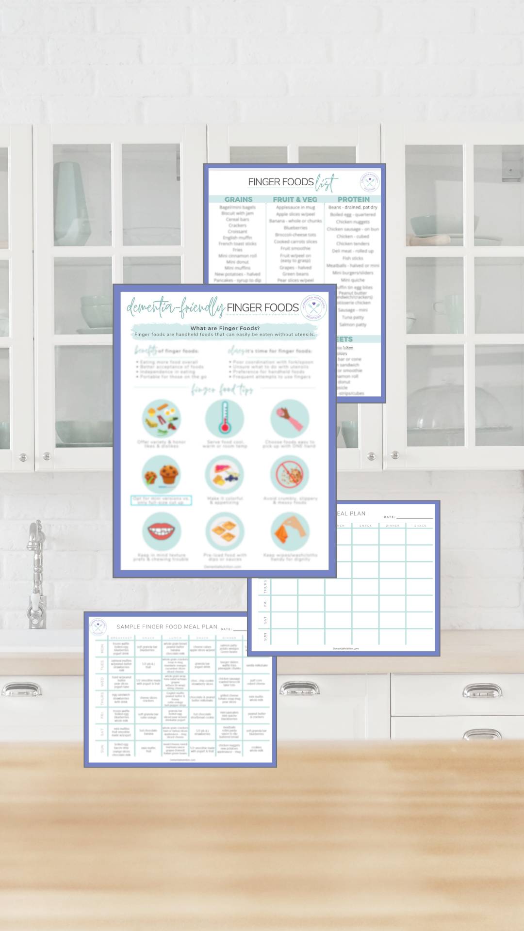 You'll also get a finger food list with 70+ ideas organized by food group, a sample 7-day menu with three meals and three snacks per day, and a blank weekly planner to customize for your loved one.